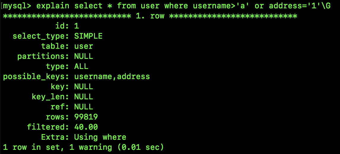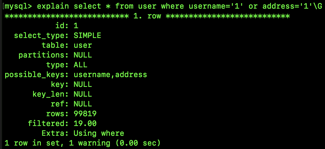 select * from user where username='1' or address='1';
