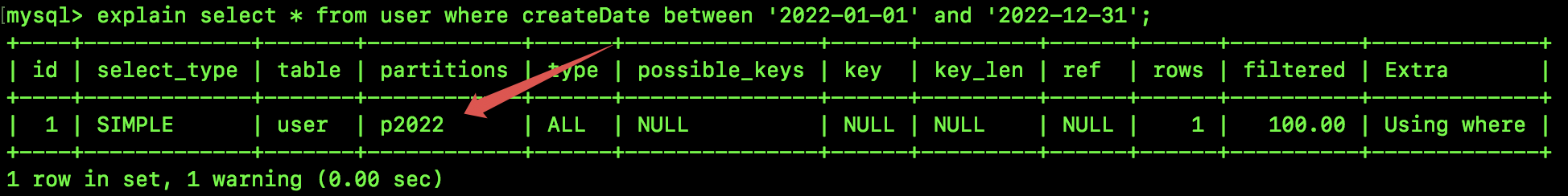 现在,如果我们要查询 2022 年注册的用户,系统就只会去搜索 p2022 这个分区,通过 explain 执行计划可以证实我们的想法: