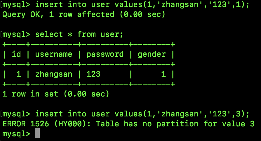 这个表将来就两个分区,分别存储男性和女性,gender 的取值为 1 或者 0,gender 如果取其他值,执行就会出错,最终执行结果如下: