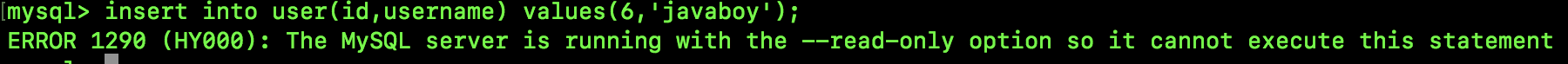 这个 read_only 对 super 用户无效,所以设置完成后,接下来我们退出来这个会话,然后创建一个不包含 super 权限的用户,用新用户登录,登录成功之后,执行一个插入 SQL,结果如下: