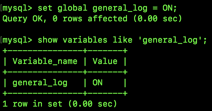 也可以通过在 MySQL 终端执行 set global general_log = ON 来开启 general log,此方法可以不用重启 MySQL。