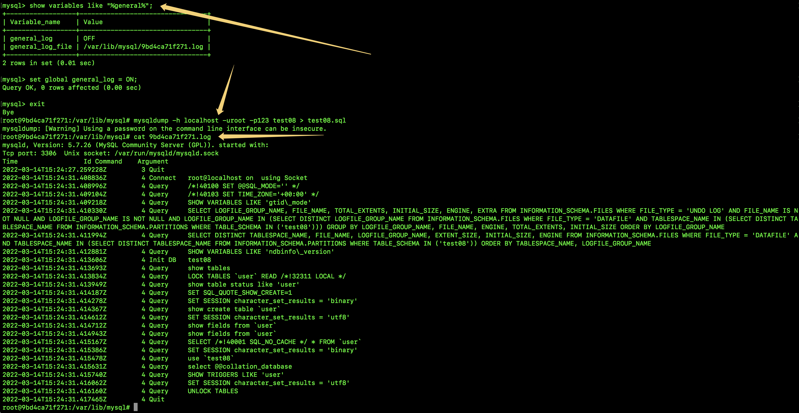 为了看到 -–single-transaction 参数的作用,我们可以先开启 general_log,general_log 即 General Query Log,它记录了 MySQL 服务器的操作。当客户端连接、断开连接、接收到客户端的 SQL 语句时,会向 general_log 中写入日志,开启 general_log 会损失一定的性能,但是在开发、测试环境下开启日志,可以帮忙我们加快排查出现的问题。