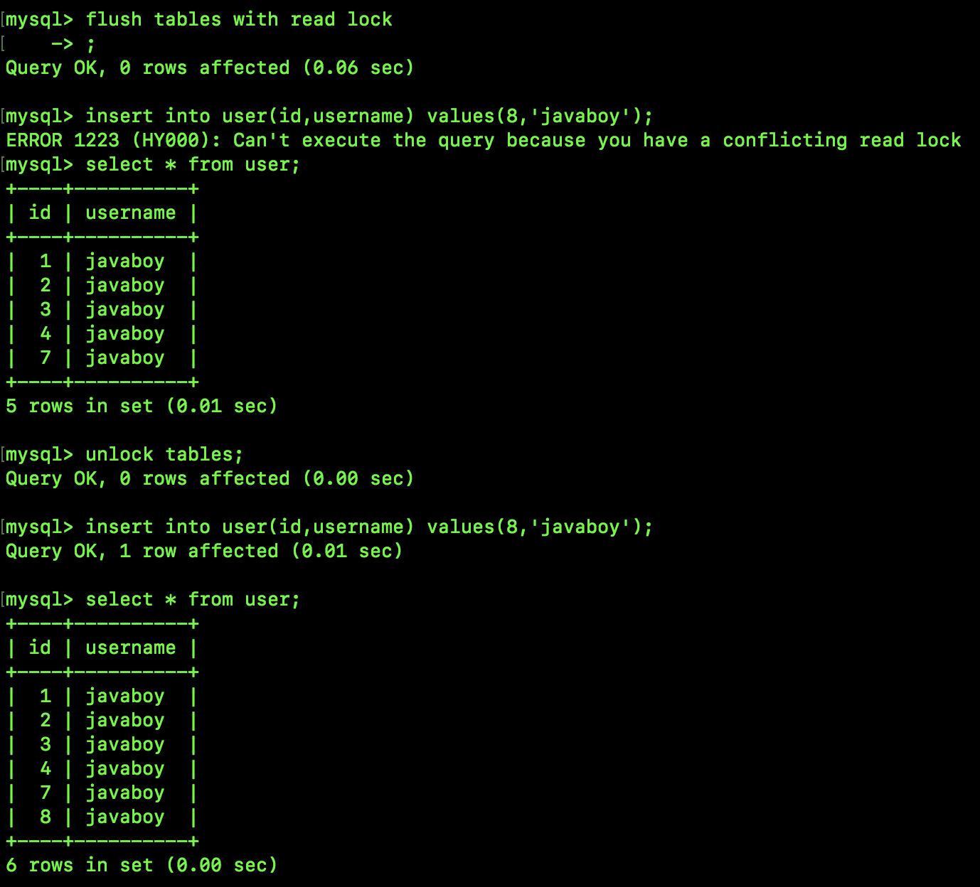 从图中可以看到,使用 flush tables with read lock; 指令可以锁定表;使用 unlock tables; 指令则可以完成解锁操作(会话断开时也会自动解锁)。