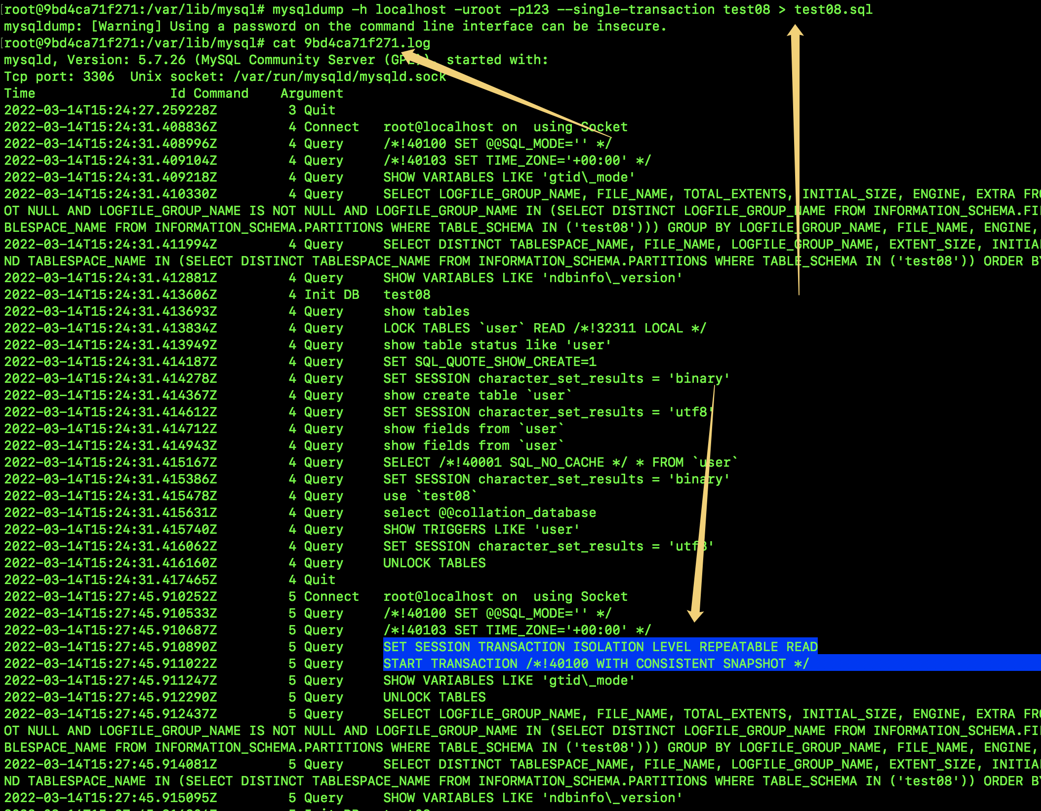 大家看我蓝色选中的部分,可以看到,确实先开启了事务,然后才开始备份的,对比不加 -–single-transaction 参数的日志,多了开启事务这一部分。