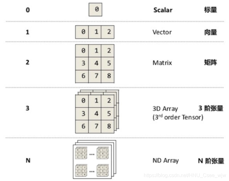 第零阶张量 (r = 0) 为标量 (Scalar),第一阶张量 (r = 1) 为向量 (Vector), 第二阶张量 (r = 2) 则成为矩阵 (Matrix),更高阶数则统一称为张量。