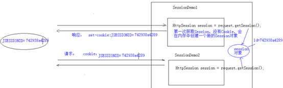 假设服务器中部署了两个Servlet程序,SessionDemo1.java和SessionDemo2.java,我们将其简称为SD1和SD2,两个程序中都有获取session的逻辑,当用户通过浏览器访问了SD1时,服务器并没有发现有session的存在,所以会在内存中创建一个新的Session对象并分配了一个编号,这里称做id,于是乎,创建一个cookie,并设置JSESSIONID等于先前分配的编号。这样一来一去的,在下一次请求时SD2时,程序就会获得这个session。