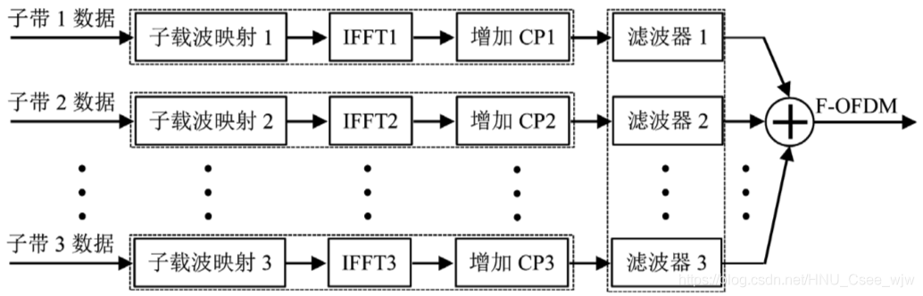 正交频分复用 (OFDM, Orthogonal Frequency Division Multiplexing) 是一种多载波数字调制技术, 也可以被当作一种复用技术。具有频谱利用率高、抗多径干扰等特点, OFDM系统能够有效地抵抗无线信道带来的影响, 例如信道的频率选择性衰落, 脉冲噪声和共信道干扰的影响。但是5G作为下一代移动通信系统,ITU给出了明确的时间规划,预计2020年推出5G通信标准[1]。现今, 5G关键技术研究已经正如火如荼开展。波形作为无线通 信物理层关键的技术之一,业界尚未对5G系统波形给出 明确定义。F-OFDM以其灵活参数配置,成为5G系统候 选波形之一。F-OFDM是由华为提出的一种可变子带带 宽的自适应空口波形调制技术,其基本思想是将OFDM 载波带宽划分成多个不同参数的子带,通过滤波实现各 子带间参数配置的解耦。F-OFDM支持每个子带可配置 不同的传输时间间隔、CP长度和子载波间隔等参数,因而实现灵活自适应的空口,增强系统对各种业务的支持能力,提高系 统的灵活性和可扩展性[2]。