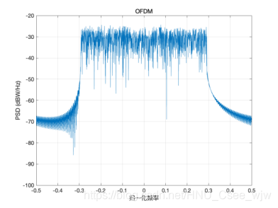 对模块参数进行设置,然后进行仿真分析,数据子载波数设为600,FFT点数设为1024,循环前缀长度为72位,采用sinc函数型滤波器与截断窗,绘制信噪比为18dB时经过高斯信道后的OFDM和F-OFDM的功率谱如图4,5。可以看出,与OFDM相比,F-OFDM有更低的带外发射,在归一化频率等于|0.5|dB时,F-OFDM功率降低至-200dBW/Hz,相较于OFDM的-70dBW/Hz,另外由于使用滤波器的原因使得F-OFDM信号受高斯白噪声的影响更小。