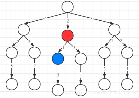 当我们停留在每一个 节点上时,都需要做一个决策,例如停留在图中红色节点上时,有[1, 3]两个数字可以做选择,如果选择了1之后再选择数字3(最后一个数字只有一个选项),则已经找到了一个不重复的数字,这一次的选择就结束了,我们会退回红色的节点继续向右子树搜索,以此类推......直到找到左右的结果。