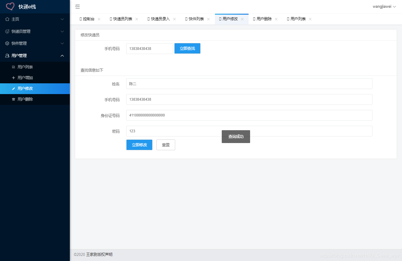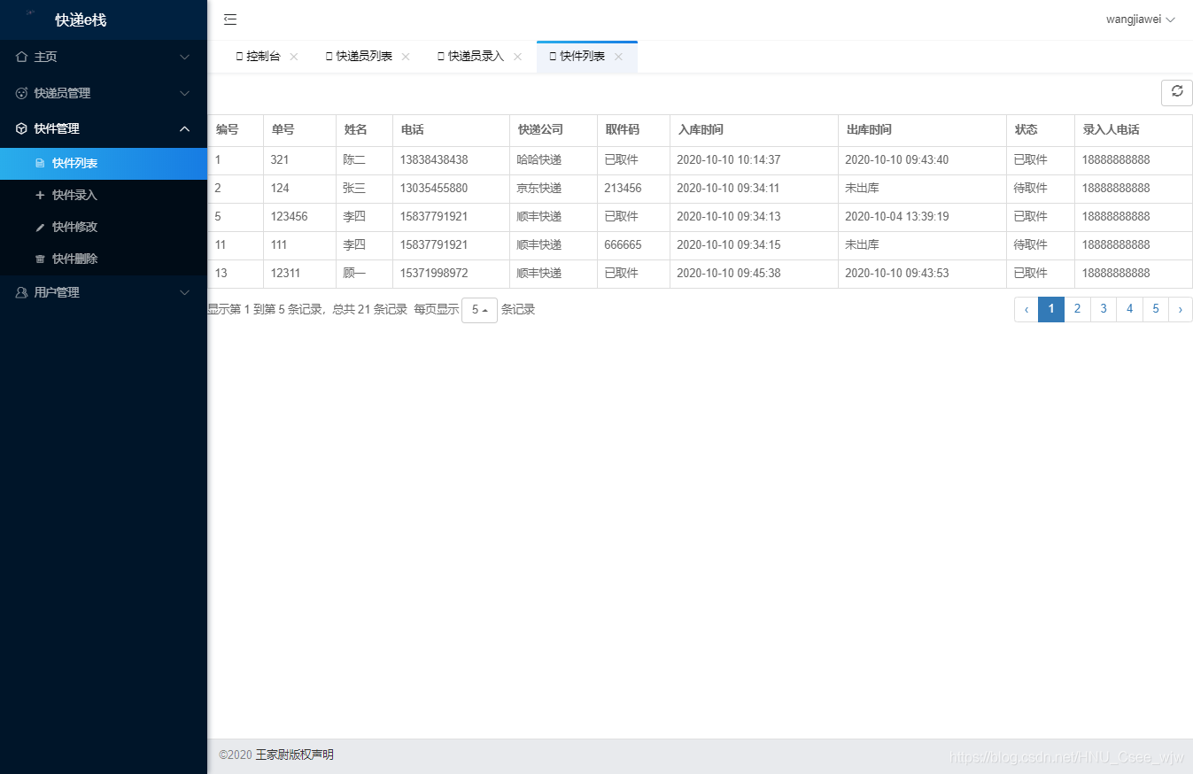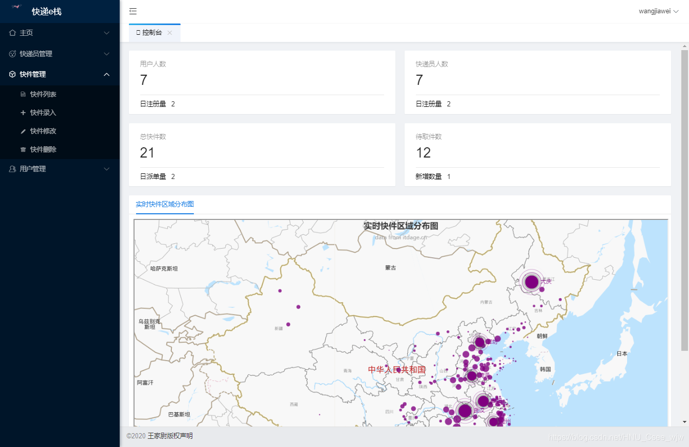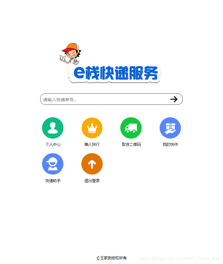 | 1.管理员登录 2.管理员退出 3.快件增加 4.快件删除 5.快件修改 6.快件列表查看 7.用户增加 8.用户删除 9.用户删除 10.用户列表查看 11.快递员增加 12.快递员删除 13.快递员修改 14.快递员查询 15.控制台-显示快件区域区分图 16.控制台-显示用户人数 17.控制台-显示快递员人数 18.控制台-显示总快件数 19.控制台-显示等待取件数量 | 1.用户/快递员登录 2.用户/快递员注册 3.用户-我的取件列表(未取件/已取件) 4.用户-快件取件码展示 5.快递员-扫码取件 6.快递员-取件码取件 7.首页根据快递单号查询快递信息 8.快递员-录入快递 9.快递员历史查询 10.个人中心-昵称显示与修改 11.懒人排行榜 |