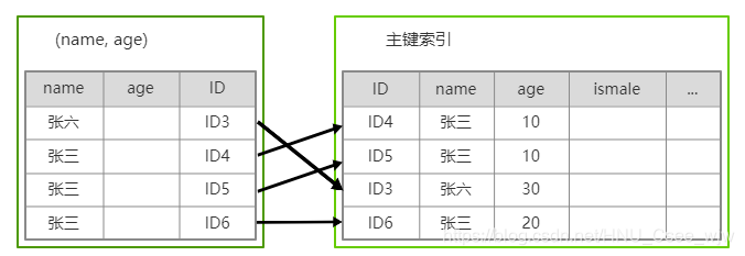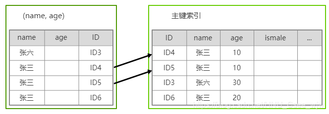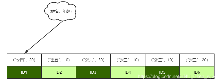 当逻辑需求是查到所有名字是“张三”的人时,可以快速定位到ID4,然后向后遍历得到所有需要的结果。