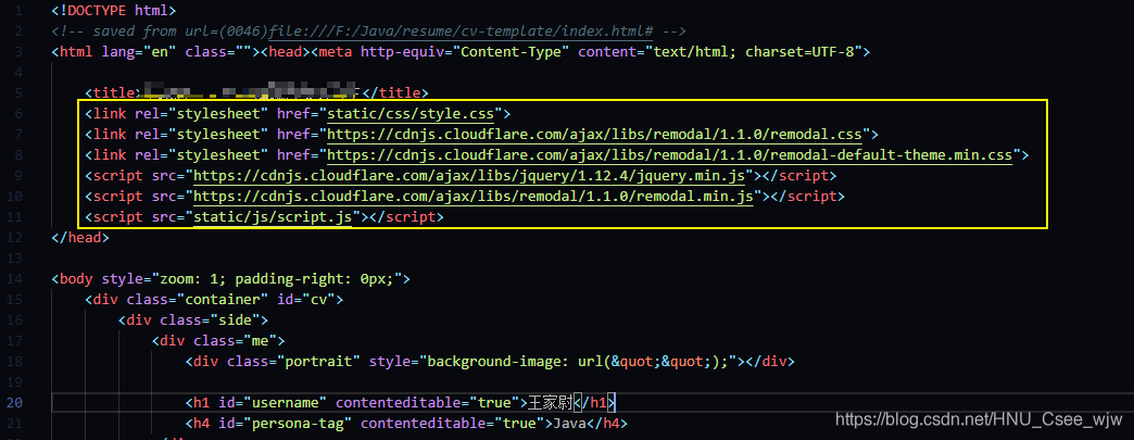 之后只保留“简历生成器.html”,用vscode打开这个html的源码,最开头的几个标签全部换成index.html里面的内容: