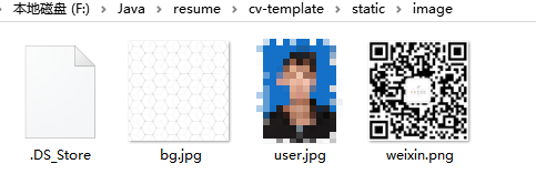 准备一张你自己的证件照放到static/images文件夹下,文件名改为user.jpg,再准备一张你的微信二维码图片也放到这个目录下,文件名改为weixin.png