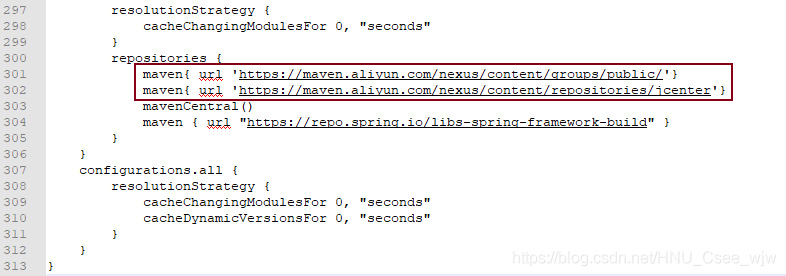gradle可以在不安装的情况下提供一个一键运行的脚本,打开Spring源码的根目录,找到build.gradle文件,添加阿里云镜像: