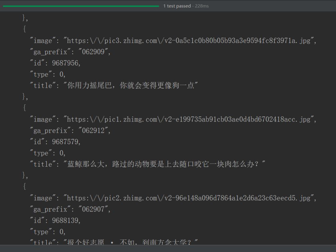 完成之后我们可以写一个测试类来验证下我们的解析器的运行情况。我们可以自己定义一组JSON串也可以通过HttpUtil工具类从网上获取。最后通过FormatUtil类来规范我们输出。