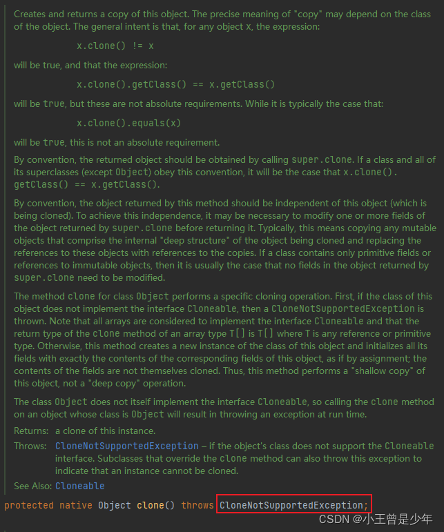 我们覆盖clone之后可以忽略这个声明(继承后,不能抛出比父类更多的异常)