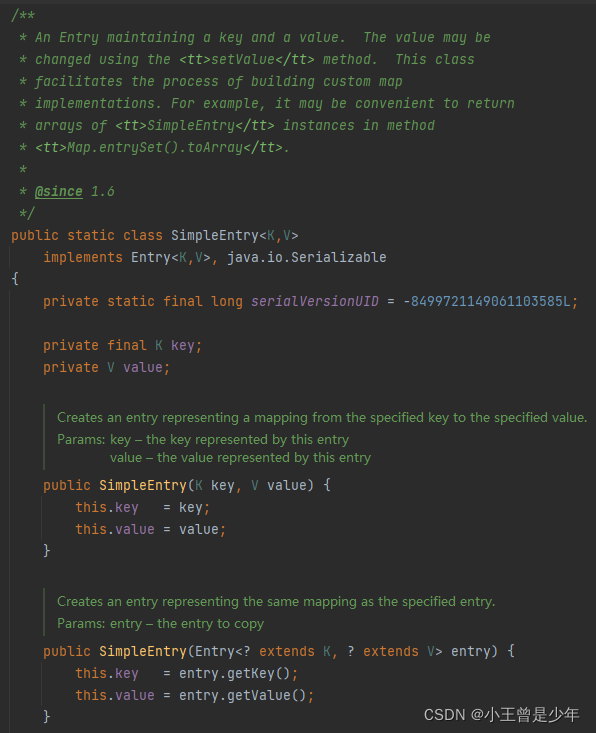 私有静态成员类的常⻅用法是代表外部类对象的组件。例如Map的Entry对象,虽然每个Entry都与Map关联,Entry上的方法(getKey,getValue 和 setValue)不需要访问Map,所以将Entry声明为非静态时就会很浪费,所以private的静态成员类是最佳的选择。