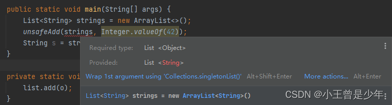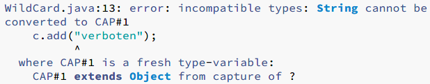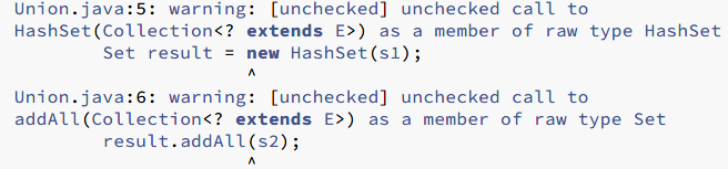 如果在unsafeAdd的声明中的参数化类型List 替换原始类型List,则编译器直接就会给出报错信息: