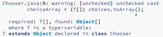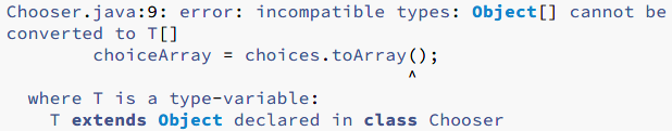 当运行它时,抛出一个ClassCastException异常,原因是pickTwo返回的值上产生了一个隐藏的String[ ]转换,Object不是String的子类,所以会报错。