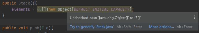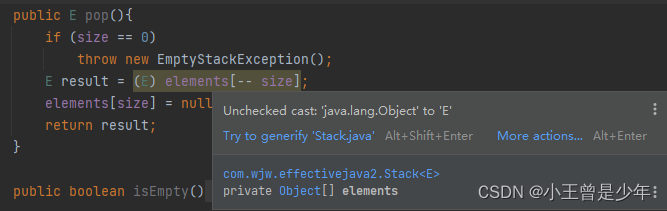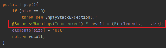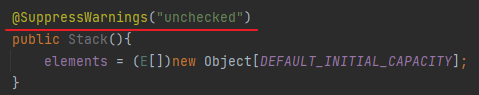 有些警告非常难消除,但还是要秉承尽可能消除每一个受检警告的原则,如果不能消除警告,但确信引发警告的代码是类型安全的,那么用@SuppressWarnings(“unchecked”)注解来禁止这条警告。