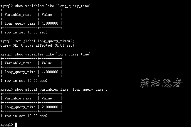 注意:使用命令 set global longquerytime=4修改后,需要重新连接或新开一个会话才能看到修改值。你用show variables like 'longquerytime'查看是当前会话的变量值,你也可以不用重新连接会话,而是用show global variables like 'longquerytime'; 如下所示: