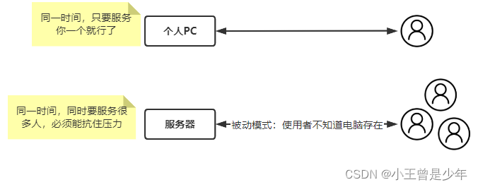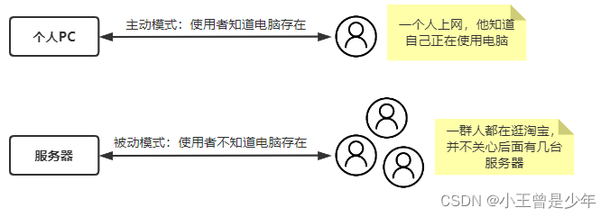 - 服务器:使用者并不知道服务器的存在,就像你逛淘宝的时候,根本不关心它的后台是有多少台服务器在运行,这属于被动型