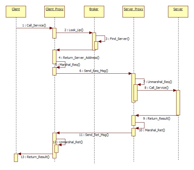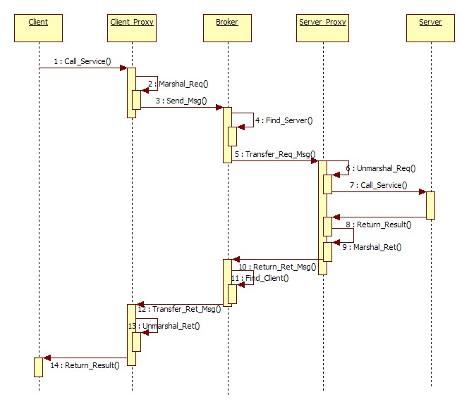 应用场景一:直接通讯方式。Client和Server相互理解他们之间的通讯协议。Broker主要完成Client和Server之间的握手。之后所有的消息、异常都是由Client与Server直接交互。(想象DNS)。简单对象交互如图: