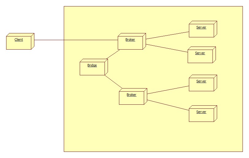 Broker:Broker可以被看成消息转发器。Broker也负责一些控制和管理操作。它能够定位服务端的位置,若发生异常,能够将异常捕获传给Client。Broker需要提供注册服务的接口给Server。如果请求来自其他的Broker,本地的Broker需要转发请求并最终将结果或异常回应给相应的远程Broker。Broker提供的服务和name service非常相像(如DNS、LDAP)。