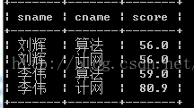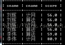 insert into stu values('003','刘辉','算法',56.0);查询成绩表中存在不及格课程的学生姓名,所有课程名和成绩信息