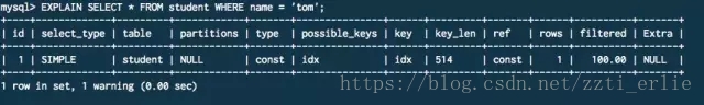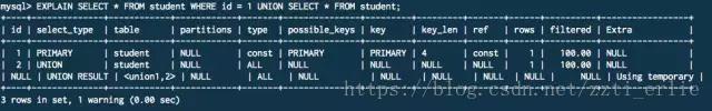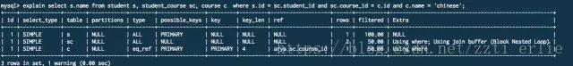 除此之外,explain 的extended 扩展能够在原本explain的基础上额外的提供一些查询优化的信息,这些信息可以通过mysql的show warnings命令得到。