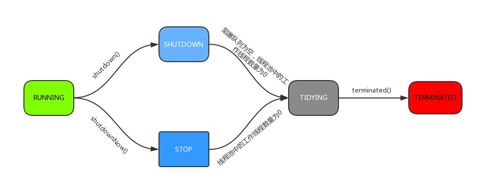 除此之外,ThreadPoolExector还提供了tryAcquire、tryRelease、shutdown、shutdownNow、tryTerminate、等涉及的一系列线程状态更改的方法有兴趣可以自己研究。大体思路是一样的,这里不做介绍。