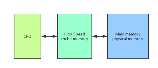 我们知道,计算机CPU和内存的交互是最频繁的,内存是我们的高速缓存区。而刚开始用户磁盘和CPU进行交互,CPU运转速度越来越快,磁盘远远跟不上CPU的读写速度,才设计了内存,但是随着CPU的发展,内存的读写速度也远远跟不上CPU的读写速度,因此,为了解决这一矛盾,CPU厂商在每颗CPU上加入了高速缓存,用来缓解这种症状,因此,现在CPU同内存交互就变成了下面的样子。