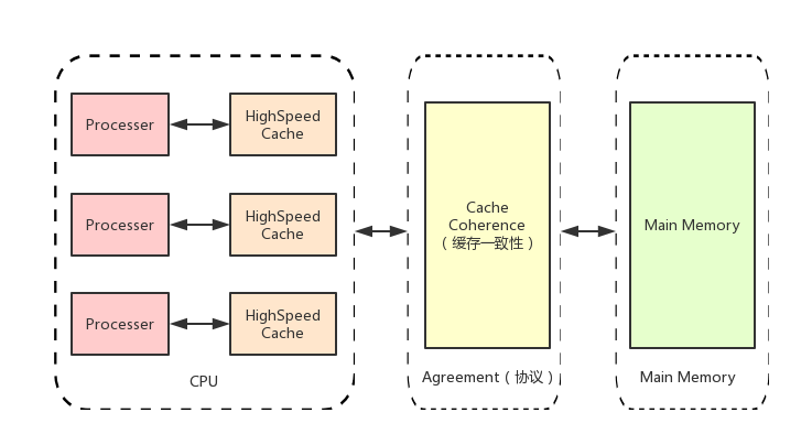 单核CPU的性能不可能无限制的增长,要想很多的提升新能,需要多个处理器协同工作。 基于高速缓存的存储交互很好的解决了处理器与内存之间的矛盾,也引入了新的问题:缓存一致性问题。在多处理器系统中,每个处理器有自己的高速缓存,而他们又共享同一块内存(下文成主存,main memory 主要内存),当多个处理器运算都涉及到同一块内存区域的时候,就有可能发生缓存不一致的现象。为了解决这一问题,需要各个处理器运行时都遵循一些协议,在运行时需要用这些协议保证数据的一致性。