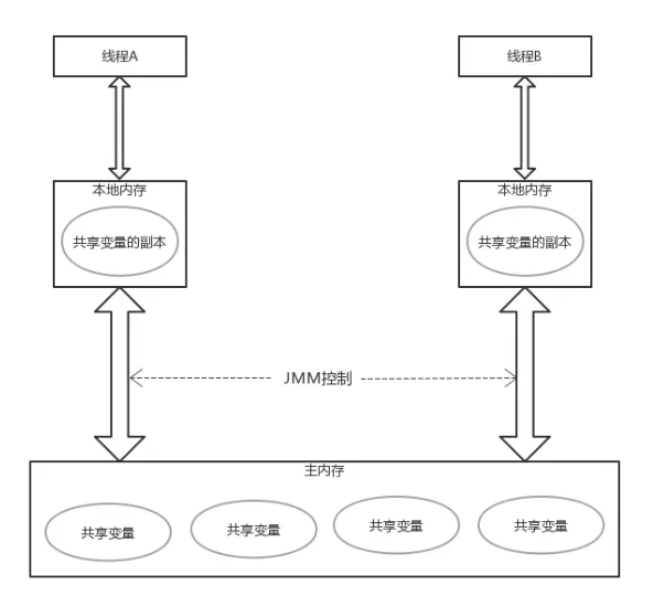 本地内存 A 和 B 有主内存共享变量 X 的副本。假设一开始时,这三个内存中 X 的值都是 0。线程 A 正执行时,把更新后的 X 值(假设为 1)临时存放在自己的本地内存 A 中。当线程 A 和 B 需要通信时,线程 A 首先会把自己本地内存 A 中修改后的 X 值刷新到主内存去,此时主内存中的 X 值变为了 1。随后,线程 B 到主内存中读取线程 A 更新后的共享变量 X 的值,此时线程 B 的本地内存的 X 值也变成了 1。