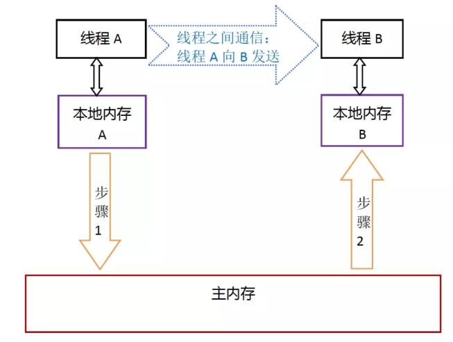 从上图来看,如果线程A和线程B之间要通信的话,必须要经历下面的两个过程: