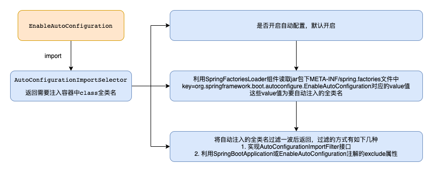 - @EnableAutoConfiguration会导入AutoConfigurationImportSelector这个类,这个类会利用SpringFactoriesLoader组件加载jar包里面META-INF/spring.factories配置文件里面填写的配置类,将这些配置类过滤一波后,返回全类名
