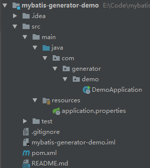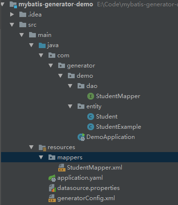 在resources目录下放配置文件,我这里放了2个文件,datasource.properties和generatorConfig.xml,其中datasource.properties中放了一个数据库的配置,如用户名和密码之类的,generatorConfig.xml引用datasource.properties其中的配置,剩下的文件夹和类都是配置好后,运行插件自动生成的