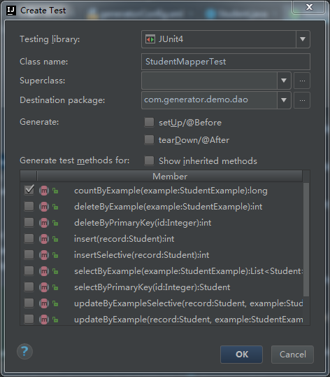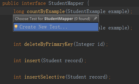 ,选中要测试的方法即可自动生成测试类,我就演示一下countByExample这个方法吧
