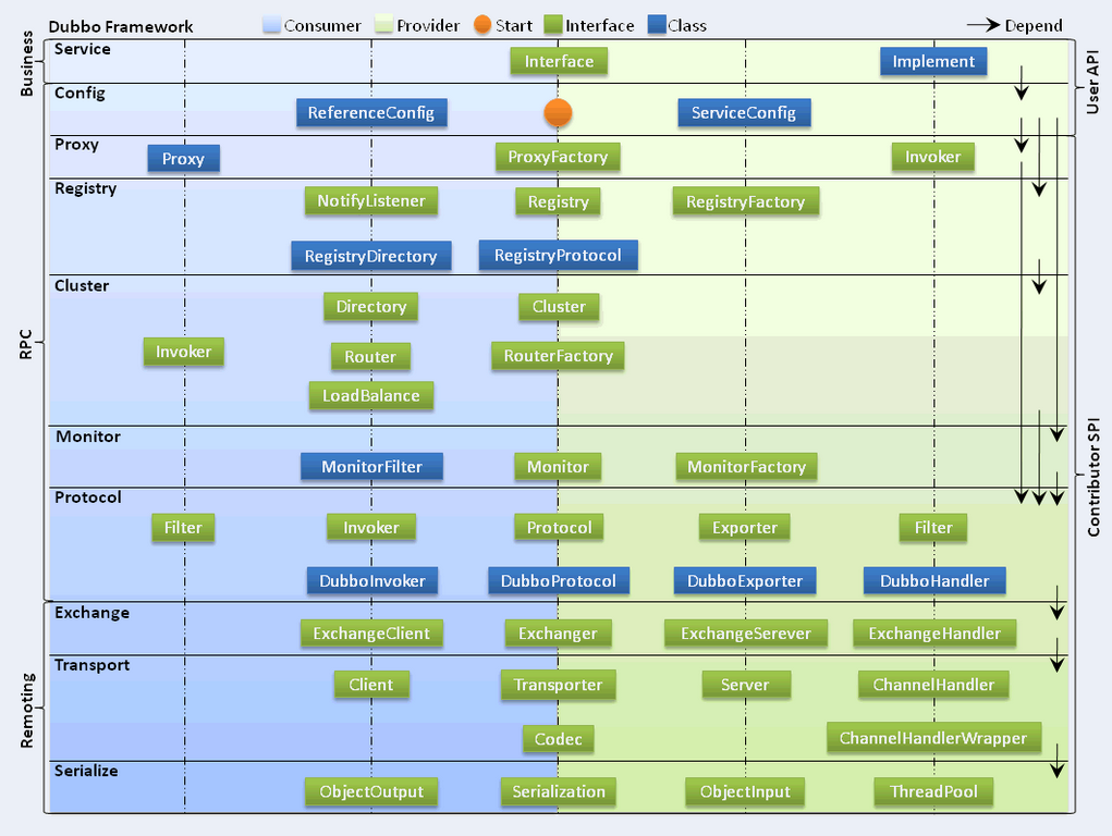 Service和Config为API接口层,让Dubbo使用者方便的发布和引用服务