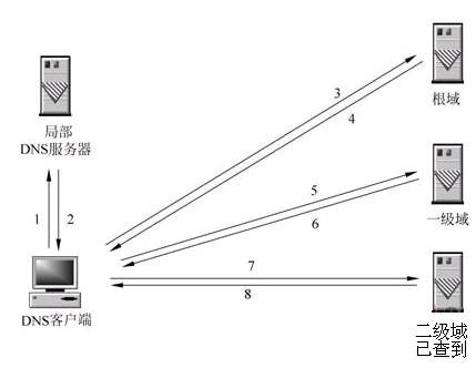 当局部DNS服务器自己不能回答客户机的DNS查询时,也可以通过迭代查询的方式进行解析,如图所示。局部DNS服务器不是自己向其他DNS服务器进行查询,而是把能解析该域名的其他DNS服务器的IP地址返回给客户端DNS程序,客户端DNS程序再继续向这些DNS服务器进行查询,直到得到查询结果为止。也就是说,迭代解析只是帮你找到相关的服务器而已,而不会帮你去查。