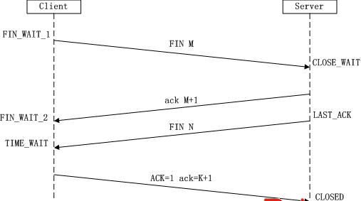 第四次挥手:Client收到FIN后,Client进入TIME_WAIT状态,接着发送一个ACK给Server,确认序号为收到序号+1,Server进入CLOSED状态,完成四次挥手。