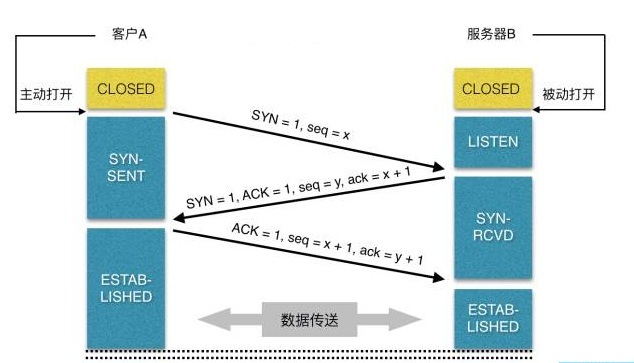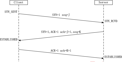 第一次握手:客户端A将标志位SYN置为1,随机产生一个值为seq=J(J的取值范围为=1234567)的数据包到服务器,客户端A进入SYN_SENT状态,等待服务端B确认;