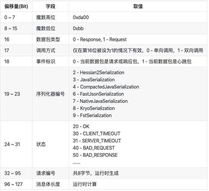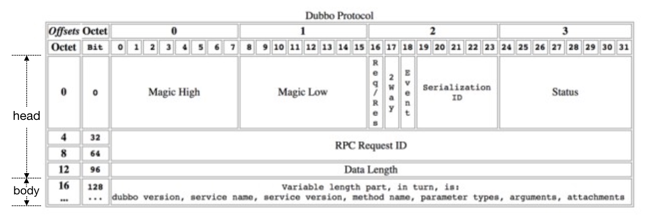 Dubbo通过自定义协议来进行通讯,协议头格式如下