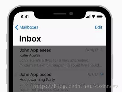 更大的导航栏。在 iOS 11 中原生导航条的设计得到了更新,它们现在更高了。 这款设计在较高的 iPhone X 上将会非常出色,并将与新的状态栏完美结合。在你的设计中,考虑使用它。在界面滑动的时候也会有一些非常好的原生动画。
