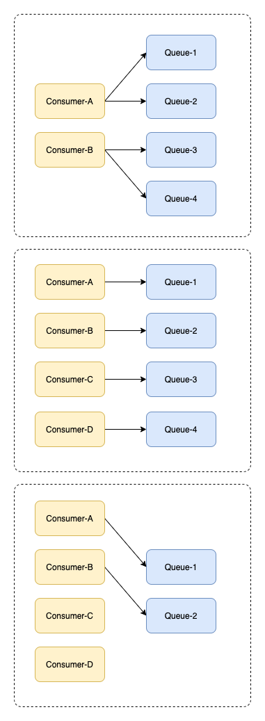 一个队列只会被一个Consumer消费,当Consumer的数量比队列的数量还多的时候,则有Consumer会被闲置,不会消费消息。之所以这样做是考虑到如果一个队列可以让多个Consumer消费要考虑并发问题,效率还提升不了多少。