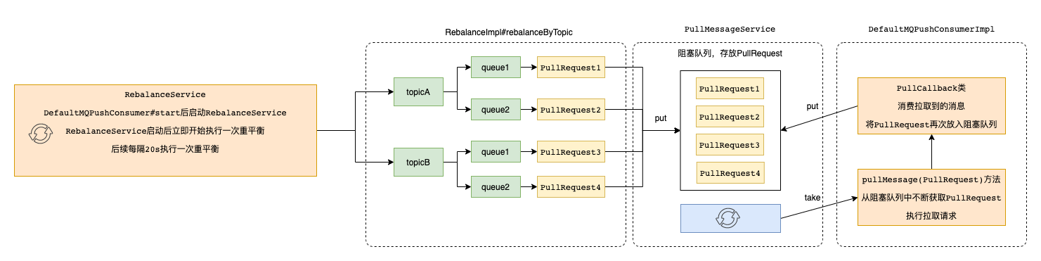 PullMessageService会不断从阻塞队中获取PullRequest,然后执行拉取