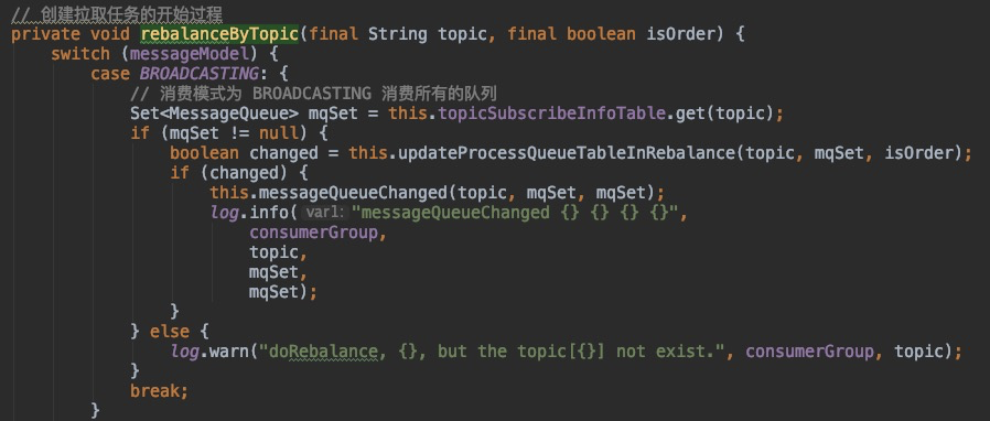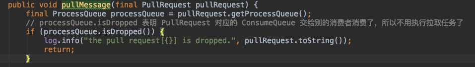 processQueue.isDropped 表明 PullRequest 对应的 ConsumeQueue 交给别的消费者消费了,所以不用执行拉取任务了
