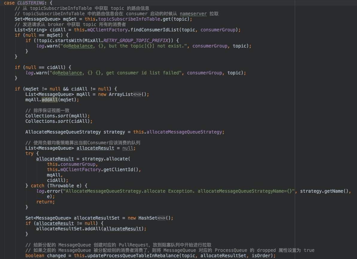 当消费模式为CLUSTERING时,会使用负载均衡策略算出当前Consumer应该消费的队列