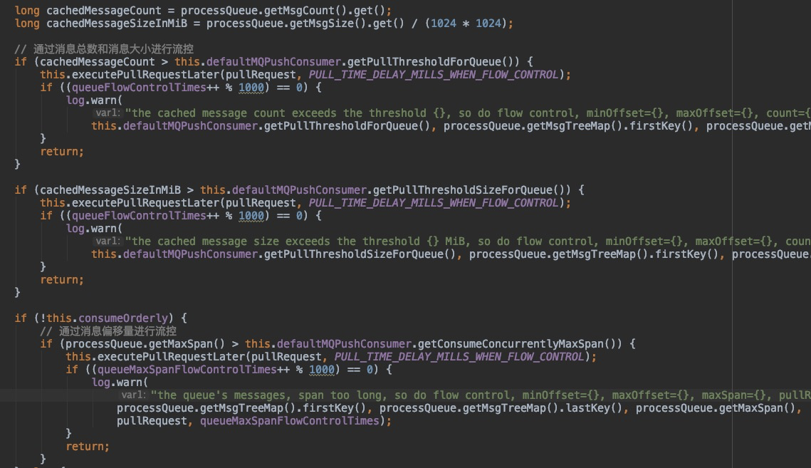 因为当PullRequest拉取到消息后,会将消息存在ProcessQueue中,而ProcessQueue则是用TreeMap来存储消息的,所以可以通过消息的总条数,总大小,以及偏移量进行流控
