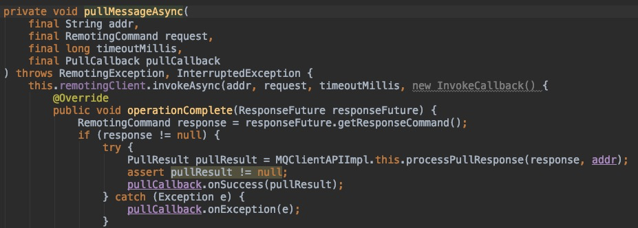 消息拉取只有异步这一种方式,最终会调用到MQClientAPIImpl#pullMessageAsync方法,